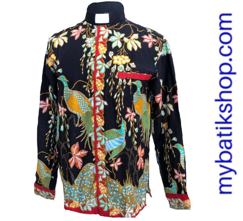High quality semi tulis batik Solo long-sleeves shirt for men. Hand-waxed and hand-drawn mix.  Roman collar insert for priest.
